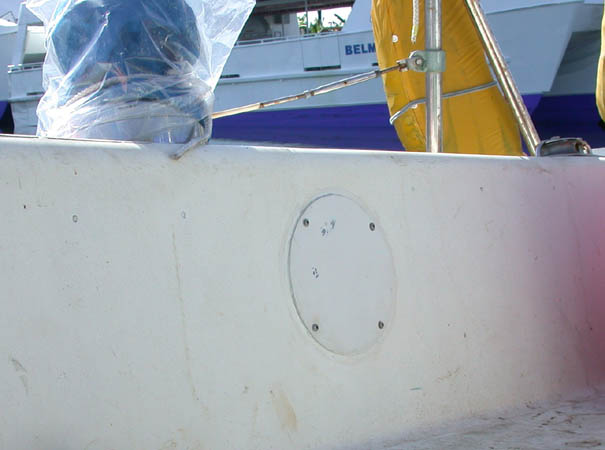The day after I arrived, using a thirty or so foot tender with twin 200 hp outboards, we rescued Malakii from the now defunct marina. Her bottom and bootstripe were hosting a maritime museum. The dock lines had stretched and sagged into the water, with the result that they too were barnacle encrusted. Before I realized I needed gloves, I cut my hands casting off. We towed her to a new marina (Cucumber Beach Marina) about five miles south of Belize City. It was a slow trip to the marina, owing to her barnacle-encrusted bottom. I had some difficulty turning the rudder, and the depth sounder gave only very sporadic readings. We got to the new marina well after dark. Malakii was somewhat the worse for wear as a result of lying neglected for five months. There was a spot on her topsides which was rubbed bare down to the fiberglass, a result of stretched dock lines and fenders no longer being positioned correctly. In my haste to return home to have my arm operated on, I had not removed the jib from the forestay, and had trusted to its being protected by the sailbag. Unfortunately, the zipper had come completely undone, and the sail had chafed on some anchor chain with the result that the sail had several small tears.