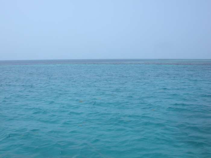 I got half way to Turneffe and the wind just quit, so I went the rest of the way on the engine, then motored north inside the reef to Douglas Cay. On the way north I kept looking at the bottom, and off to the western horizon where the reef should be, submerged. I decided it was a ways down, and I might be able to cross it coming from English Cay and save a lot of time next time.
