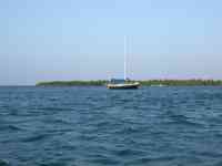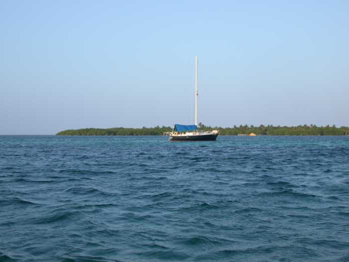 As I went through the cut, the wind changed, so I doused the chute and put the main and #2 back up. I edged by Buzzard Shoals, where a half-dozen small Belizian fishing boats were anchored in about twenty feet of water in what seemed like the middle of nowhere. I was a hundred yards north, in 150 feet of water.