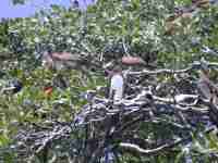 The Gumbo Limbo trees are full of Frigate Birds and Booby Birds. Frigate birds have up to a seven foot wingspan. They fly well, but don't dive well and cannot land (and take off!) on water. So they harass other birds, like the Boobies, and try to rob them of whatever food they have. This happens in mid-air, and is interesting to watch. Apparently they also will rob the nests of both eggs and young.