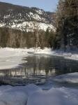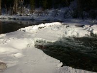 I continued my snowshoe on up the river, thinking maybe it would be frozen where it was real shallow near the upper swimming hole. That's the first place where I can cross with the horses in the summer as the river starts dropping. It was frozen about half way, but there was still a good stretch of open water. I took a long shot and tried to bridge it with one of my poles, but the pole wasn't quite long enough and just washed downstream.