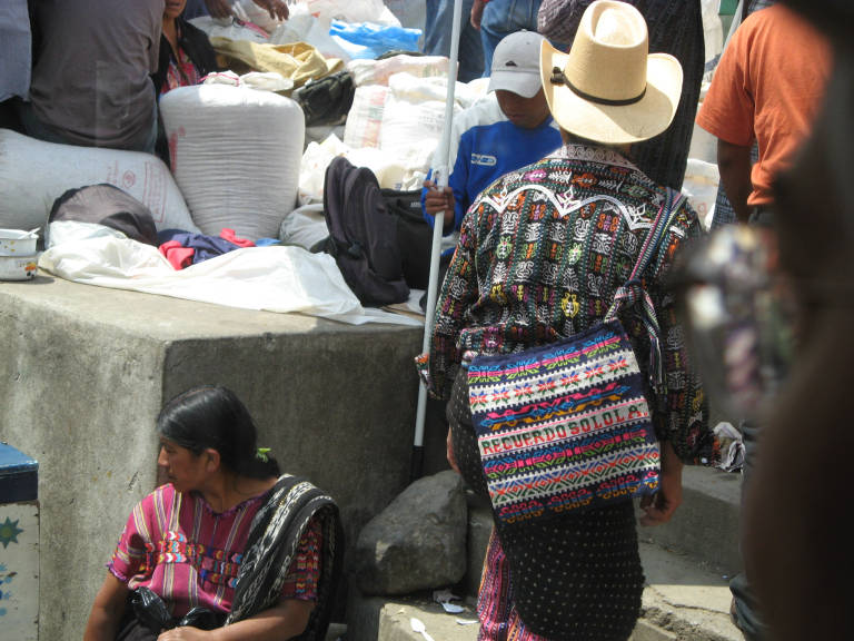 Our bus was somewhere between an express bus and a chicken bus. We made pretty good time at first, but as we got into the highlands, we started stopping at more places. The seats filled up, and then the aisles. We were definitely not on a tour bus. At one point we had to stop for some road construction. As usual, vendors came scurrying up to the bus, offering food and newspapers. There were some women with some kind of woven baskets, and since Dona makes baskets, we hopped off to look at them. I'd never seen this kind of basket before, and we hadn't seen any in the big craft market in Guatemala City the day before. It seemed like as good a place as any to buy them, since it wasn't a regular tourist stop. I figured we would see them all over around the lake when we got there, and we'd see whether or not we paid too dearly. But as it turned out, the baskets were somewhat unique. We looked everywhere and talked to other people, and never saw them again. We even had some Guatemalan people ask us where we got them.