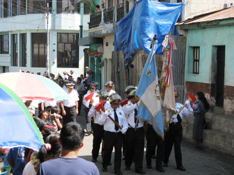 Our walk through town was livened up by the screech of sirens and the blat of a tuba. The volunteer fire department was having a parade. They wound their way through the crowded streets, and somehow didn't run over any of the produce being sold.
