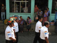 When walking through town, a boy about ten years old asked us if we wanted to see a statue of a Mayan saint. I didn't know such things existed, so we said sure, and followed him up and down and around until we came to a small building that looked like every dwelling around -- rusted tin roof, part cinder block walls, part whatever was available. There was one small room in the tiny structure with a carved statue of a person, a cross between a wooden indian and something else... Buddha? He was smoking some incense or cigarettes, I can't remember which. It was 2 q apiece to view, 10 q for a picture, and I didn't want a picture that badly. There was also a statue / sculpture of Christ, "Santa Christo," laying prone in a case, taken out for the Semana Santa (Holy Week, the last week of Lent) parade once a year. I don't quite understand the name "Santa Christo," since I thought in the Christian faiths Jesus was supposed to be the son of God, not a saint, and I've never heard of a "Saint Christ" in English. Hanging from the ceiling was what looked like Buddhist prayer flags... not. More like they'd cleaned up the side of the road and hung everything they found up there. I couldn't decide if this was legit or a tourist scam, but it was entertaining.