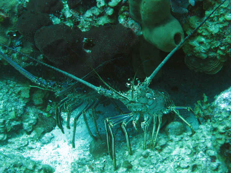 I went for a dive with the folks at Isla Marisol. We did a dive just northwest of the cut. What a delight! There were lots of turtles. We saw a big loggerhead, five or six feet, longer than a person is tall. I also saw a few nice lobsters, big hogfish, and a few good grouper but not really big. Also porcupinefish and spotted trunkfish.
