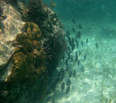 We spent the next day snorkeling around inside. We moved the boats a little closer in during the afternoon in anticipation of more wind. There are few sand patches off SW Cay; it's mostly turtle grass. So I dove on the Danforth and buried it by hand. The anchor was in eight feet of water but I let out 150' of scope, so it was good for anything -- as long as it came from the anticipated direction. We played scrabble in the evening, and I learned some new words.