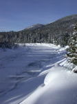 With the melting and refreezing, there are only a few marginal snow bridges across the river -- just wide and strong enough for a person on skis, but not sufficient for snow machines. We crossed over on one of these, then headed up an old logging road spur known very locally as "Bear Alley." Unfortunately, or fortunately, depending on your perspective, we didn't see any bears. But we did see some deer.