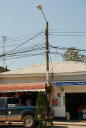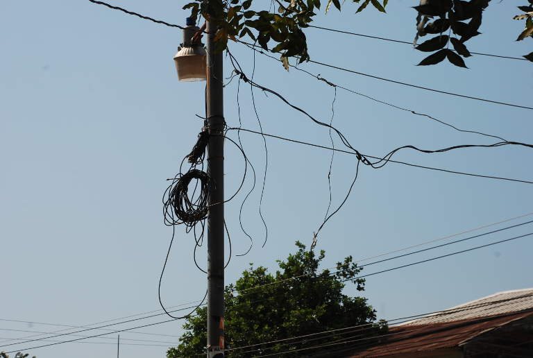 It was stiflingly hot, and we were really low on energy. While we were waiting, we couldn't help but notice the electrical system in town. There was an outlet on a tree in the middle of the town square, simply a hot tap off of the power line, unfused. There were "bandit" taps in several places, a real rat's nest of wires coming down to serve some of the stores and houses. I'd hate to be walking barefoot through the park when it's raining...