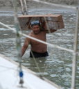 Finally things were ready and Abel lowered the car into the lake. I brought Malakii into line with the upright supports and killed the engine. The yard hands tied our bow and stern to the uprights so we woulding tip over as we were hauled out of the water, and then the hard part began. Malakii has a fin keel, so when she is out of the water resting on it it's like resting on a single point. She would tend to tip forward and bury her bow in the dirt, so they need to block up the bow. On a conventional long keeled boat, the boat rests comfortably on the long line of the keel. It took the guys over an hour to build a stack of cross-hatched Santa Maria beams for the bow to rest on. Santa Maria is a really dense wood, so dense that it doesn't float. Or at least these well-used beams didn't. It took one or two big guys to haul the timbers down to the water, and then they had to muscle them into place underwater under the bow.