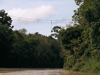 There are oil palm plantations all along the river, and they have left only about 50 m of jungle by the river. Apparently the orangutans don't like to get wet, so where a tributary comes in, it blocks the orangutan from moving further down (or up) the river. To get around this problem and allow the orangutans to move around more widely, conservationists have built rope crossings.