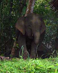 ... And there they were! We found them in amongst someone's weekend retreat, generally raising havoc, eating the leaves off the roof and taking things apart to see what might be in them. I've never seen a full-grown African or Indian elephant in the wild, and I haven't seen one in a zoo for ages, but I know they're big. These Pygmy Elephants were ... well, pygmy. About two meters tall, which is still a big animal, but not a giant. And I certainly wouldn't want one to charge me or put its foot down on mine.