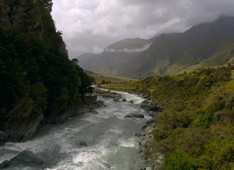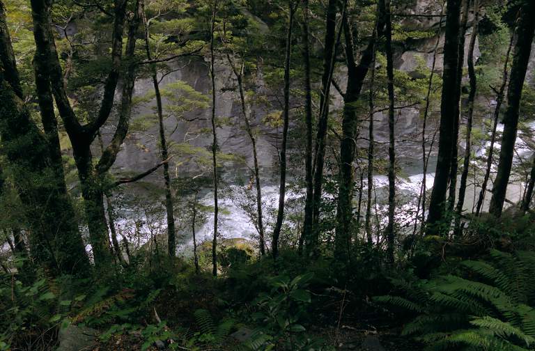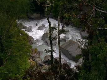 We came to a fork in the trail, and had to make a choice. If we stayed to the left we would head up the valley towards the Mt. Aspiring hut. Looking at the map, we might get a nice view of Mt. Aspiring — if the clouds lifted enough to see anything at all. If we went right and crossed the river, we would be on a hike up to the snout of Rob Roy Glacier, which seemed pretty much socked in at the time.