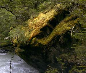 After a fair bit of uphill work, we came to a big waterfall-filled cirque with Rob Roy Glacier hanging over everything. About all we could see of the glacier itself was the terminus, but we got a great view of the waterfalls. We got narry a glimpse of Mt. Aspiring. Pooey! Some other time... I suspect it is pretty spectacular on the two days a year when the sun is shining ;-)!