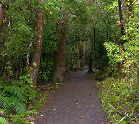 At one point we were sitting in the car trying to figure out what to do. I scratched my ear and Dona thought it was an earthquake. Honest! It says so right there in my diary. Anyway, we headed up the road to Turangi, a small town on the north side of the park about 10 km from where I was going to start the walk. When we got there we stopped at a New Zealand Department of Conservation office to go to the bathroom. We were checking the exhibits out and happened to see that day's weather forecast on the wall, about an hour old. It said fog and drizzle, clearing around noon, clear in the afternoon, and showers the next day.