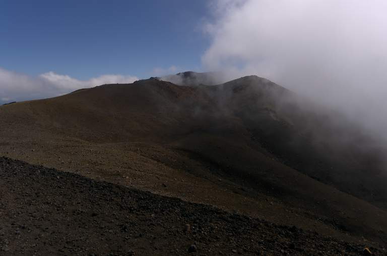 As I continued on up the trail, I started seeing occasional patches of blue sky — the clouds were finally starting to burn off! My mood improved but I kept my pace down, wanting the fog to burn off enough to enjoy the views. People started streaming by, coming at me like a concert or a ball game had just ended. As I walked in and out of the mist, I got a glimpse of Mt. Ngauruhoe and the Central crater.
