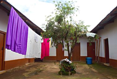 Our room was spare, with a bed and table. We had our own squat toilet and a sink; the sink had a non-functional drain. To flush the toilet, you poured water down it from a bucket. All adequate for our needs, and given the wet weather more comfortable than our tent would have been. The rooms face an inner courtyard containing a bottle-brush tree and the laundry line.