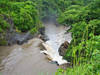 The natural bridge and waterfall is on the Kiwira River, located inside the Kiwira Prisons Training College grounds. The falls, "Cooking Pot" or "Kijungu" Falls, drops through a small arch into a pool. Apparently, somewhere in the bottom of the pool is a hole where the water goes underground. It then erupts back at the surface ten or so meters away. The whole thing is pretty impressive. Kijungu means Cooking Pot in the local dialect, and refers to the shape of the pool where the water disappears underground. One source says the water takes seven days to return to the surface. I find that a bit hard to believe given how close the return flow is to the pool where it disappears; I could find no authoritative research to back up this claim.