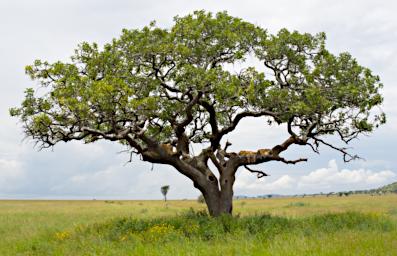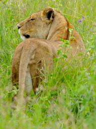 On the way we found a lioness up a tree, with another lioness on the ground and three cubs. The lionesses didn't seem particularly alert, but they weren't just lazing around either. One periodically stared out over the tall grass; we couldn't see anything out there. The cubs were just laying around, not interested in their moms' activities.