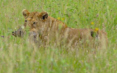 Then she broke into a run and we heard loud squeals. We didn't see much, just her tail in the air, and then she came up with a baby warthog in her mouth. She dropped it and killed another, and I think the second lioness was after the mother. In the end, all the warthogs were killed — or at least that's what we think. We weren't about to go check it out to be sure.