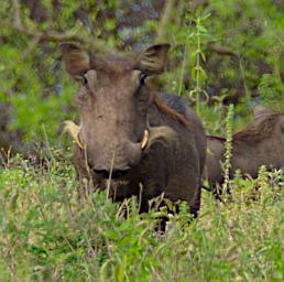 We came upon a lone bull elephant who didn't seem to know exactly what he wanted to do. At first he was sucking water out of a puddle by the side of the road and spraying it on himself, then he was simultaneously peeing and giving himself a dust bath. For a while it looked like he was a bit upset and was going to come down and beat up on us, but then he wandered off. We also came across a few tiny groups or lone wildebeests known as the blue wildebeest, the white-bearded wildebeest and the brindled gnu. A far cry from the huge herds that were up on the Serengeti.